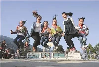 广西柳州市融水苗族自治县大年乡高马村小学师生一起开展体育活动。