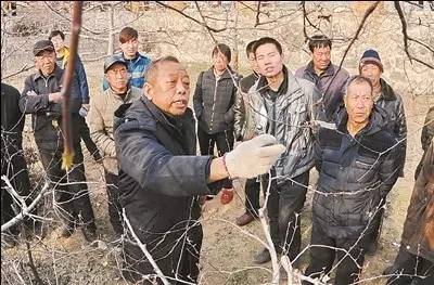 李保国(前左)在河北省内丘县岗底村向村民讲解果树修剪知识(1月27日摄)。