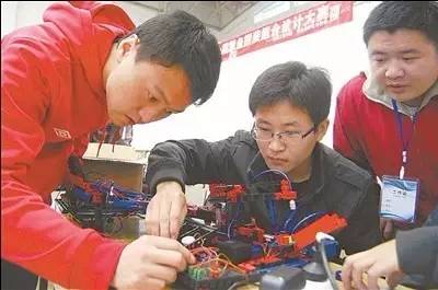 4月12日,江苏科技大学举办首届慧鱼机器人拼装组合设计大赛,图为大学生在进行机器人拼装比赛。