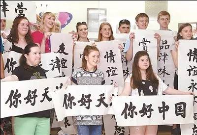 6月10日,在天津国际汉语学院,参与“妙笔练书法”活动的苏格兰师生展示自己的作品。